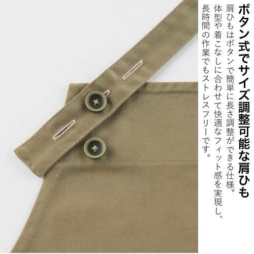 ボタン式の肩ひもでサイズ調整が可能なため、着る人に合わせて快適なフィット感を実現。